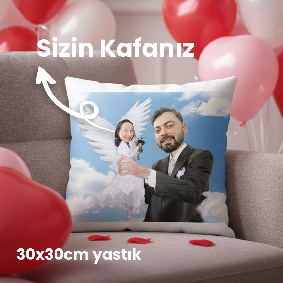 Bu Sevgililer Günü’nde klasik hediyelerden sıkılanlar için hem eğlenceli hem de anlamlı bir sürpriz! Gökyüzü temalı, melek kanatlı ikonik gelin ve damat figürlü bu özel tasarım yastık, evinizin en neşeli köşesi olmaya aday.